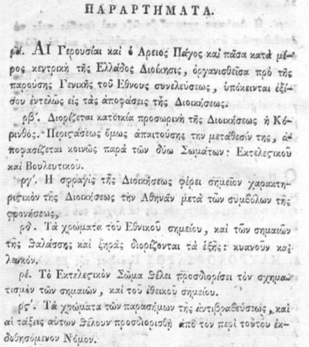No a potem to już poszło: w 1822 roku, podczas I Zgromadzenia Narodowego w Epidawros przyjęto Tymczasową Konstytucję, w której zapisano kolory ujednoliconej flagi powstańczej (błękitny i biały, a więc nie np. czerwony i czarny, jakie też się zdarzały), a zarządzenie Ciała Wykonawczego kilka miesięcy później opisze flagę wojsk lądowych jako niebieski kwadrat, podzielony białym krzyżem na cztery równe części: żaden z następujących później dokumentów nie usunie krzyża. Tyle wybrany kontekst.