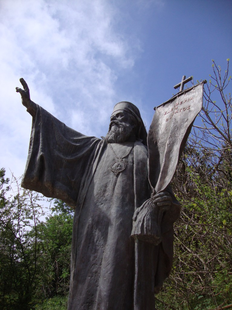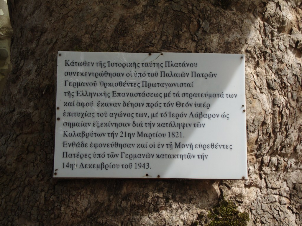 Na tablicy przywierconej na centralnym platanie w Agia Lavra nie ma mowy o 25 marca, natomiast wspomniano, że stamtąd właśnie, poświęciwszy sztandar (z krzyżem, bo i klasztorny), wyszli zdobywcy Kalavryta z 21 marca.